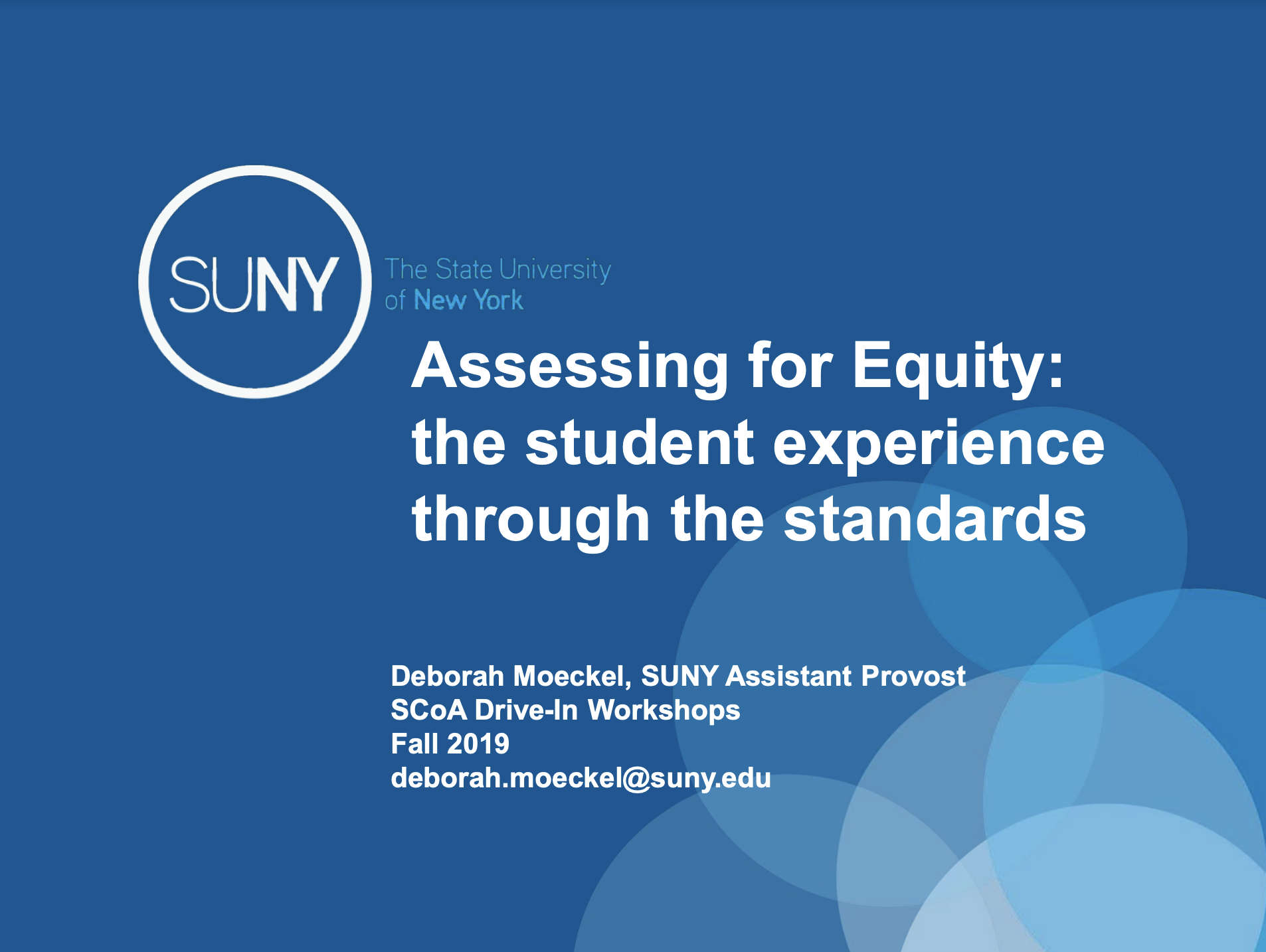 This one-day workshop on assessing for equity focused on utilizing assessment to promote diversity and equitable outcomes on campuses. Workshops explored the linkages between SUNY expectations, Middle States Accreditation and meeting local goals, expectations, and experiences measuring student success as well as achievement of outcomes aligned with the institutional missions.