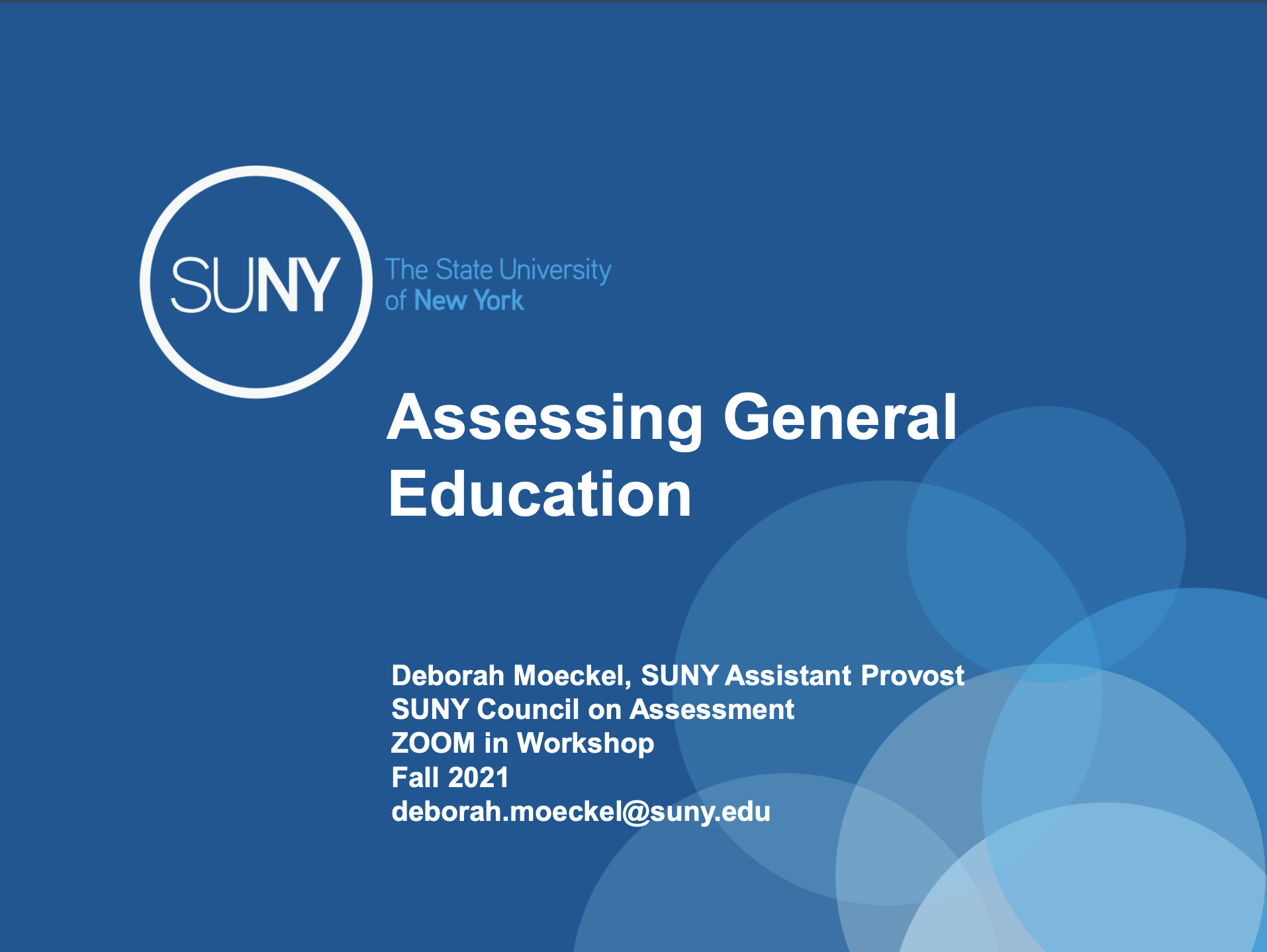 This remote gathering will enable those involved in assessment on their campuses to learn about ways to leverage existing assessment data and procedures to move forward with meaningful changes related to the SUNY General Education Framework, self-study preparation, and student learning outcome assessment. The virtual session will include a presentation featuring The New Framework: SUNY General Education Assessment updates from Dr. Deborah Moeckel, Assistant Provost for Assessment and Community College Education and a panel discussion highlighting perspectives representative of diverse institutional areas currently involved in assessment, self-study preparation, and accreditation work. The session will conclude with concurrent breakout group discussions focused on student learning outcome assessment representative of a variety of areas and disciplines. The session will be interactive and offer participants opportunities to share examples, ask questions and discuss ideas pertaining to existing practices and planning for meaningful change.